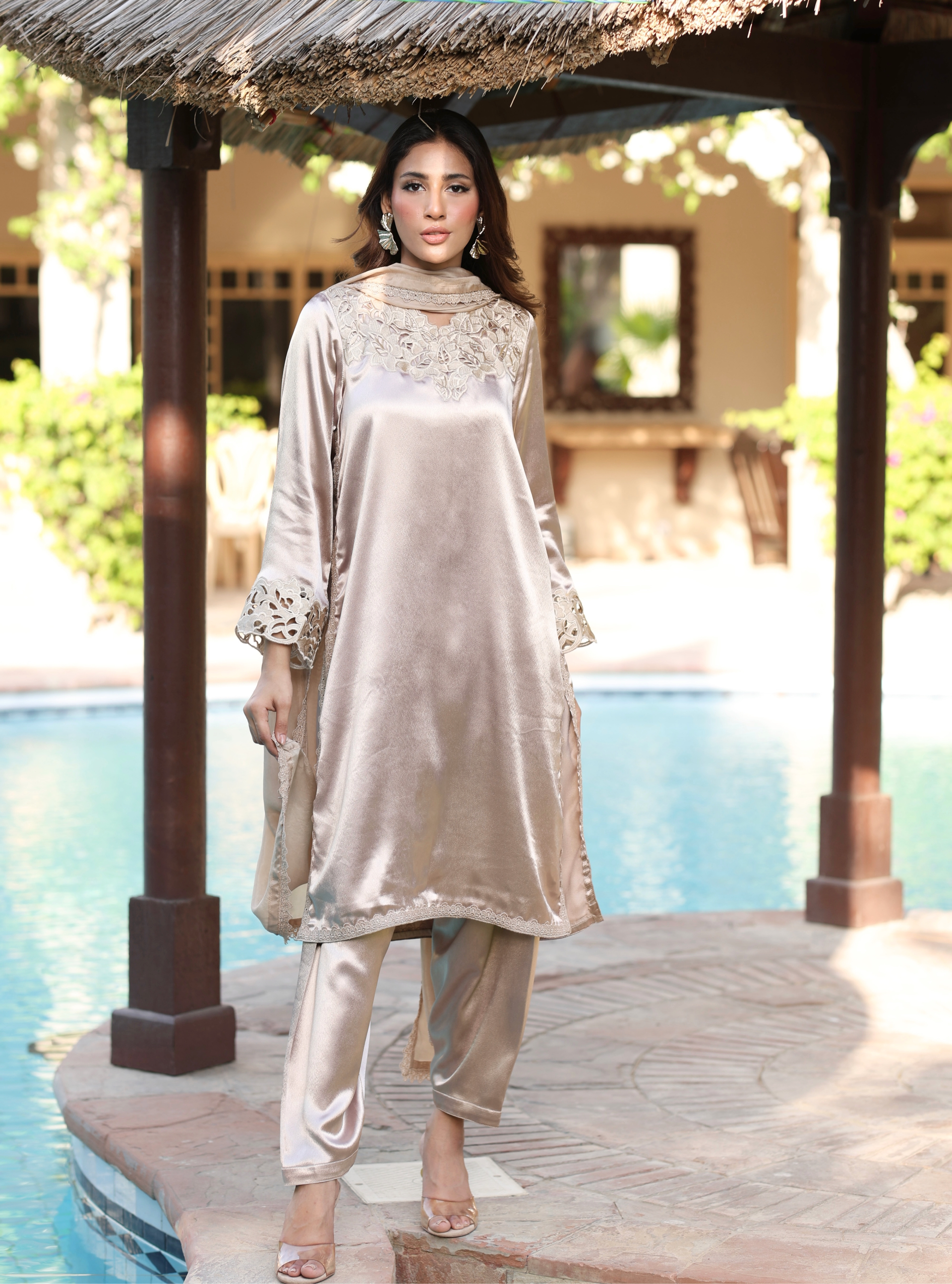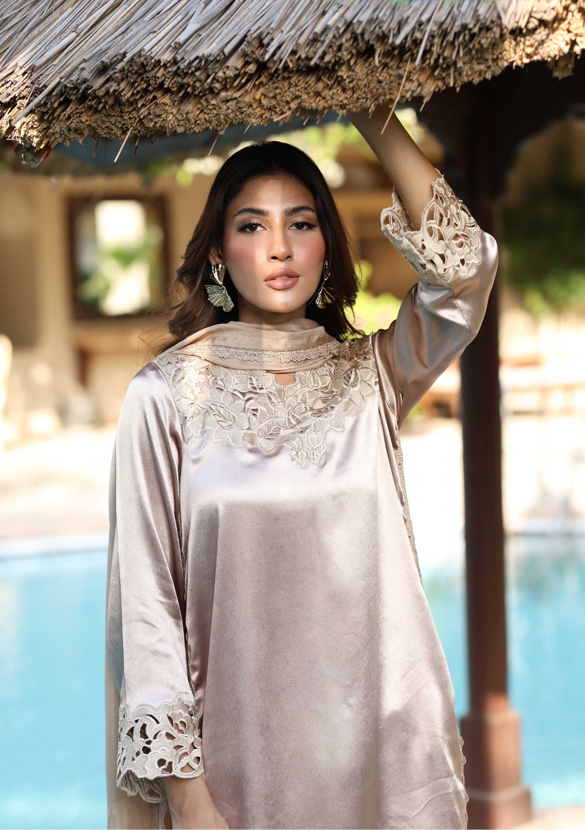This combination of cutwork, lace detailing, and embroidery creates a harmonious blend of traditional beauty and modern refinement, making it a timeless choice for special occasions.