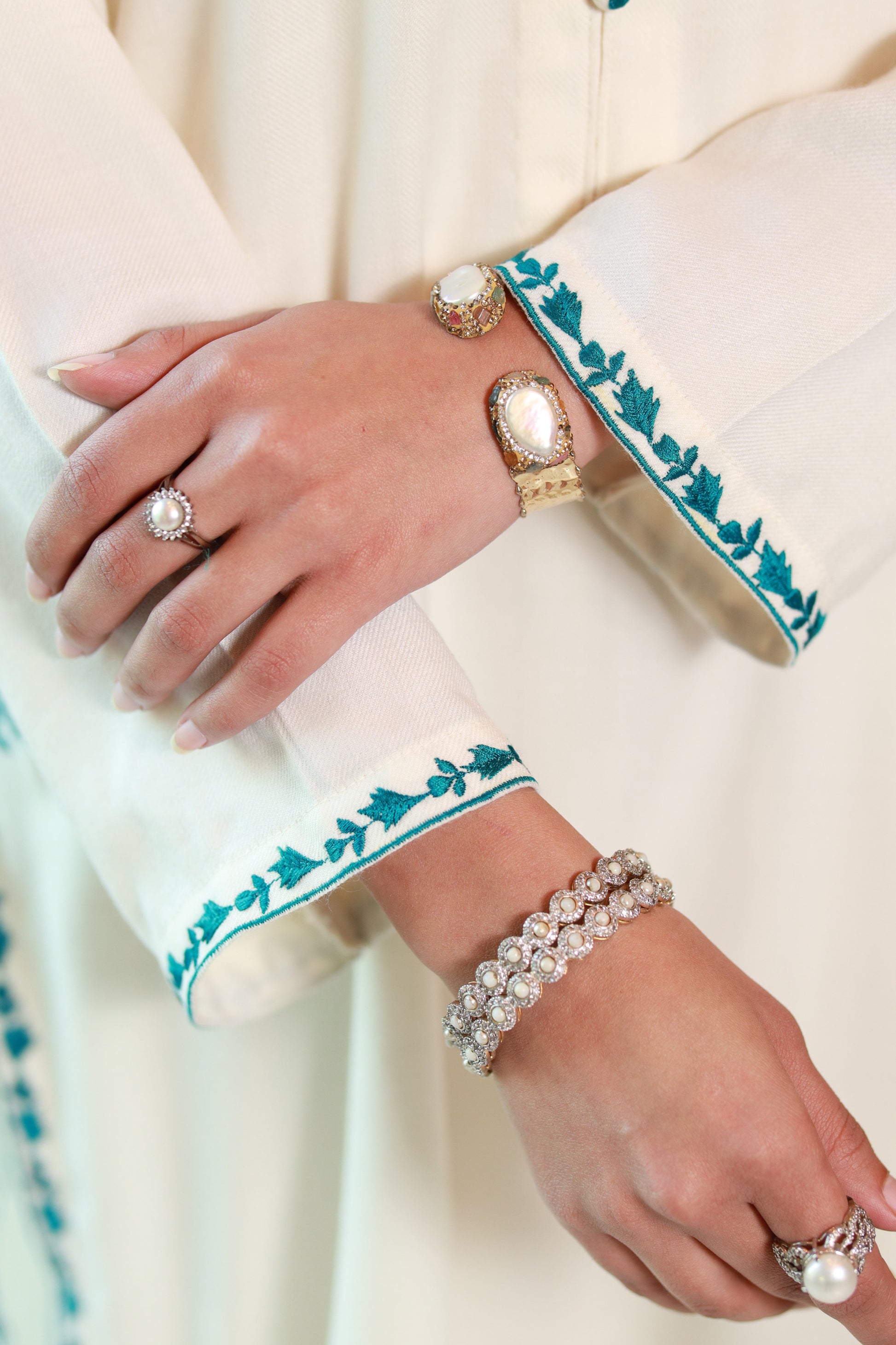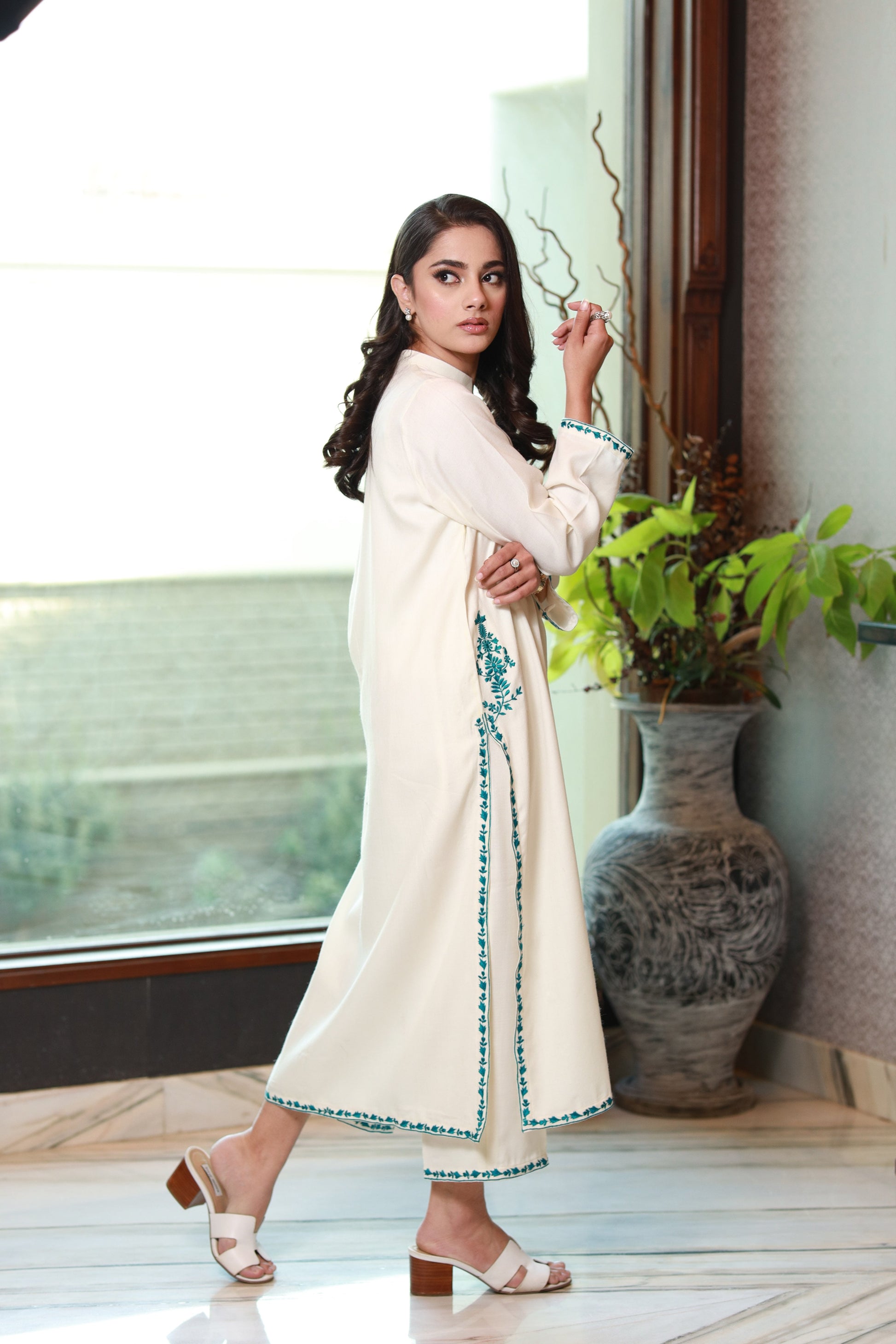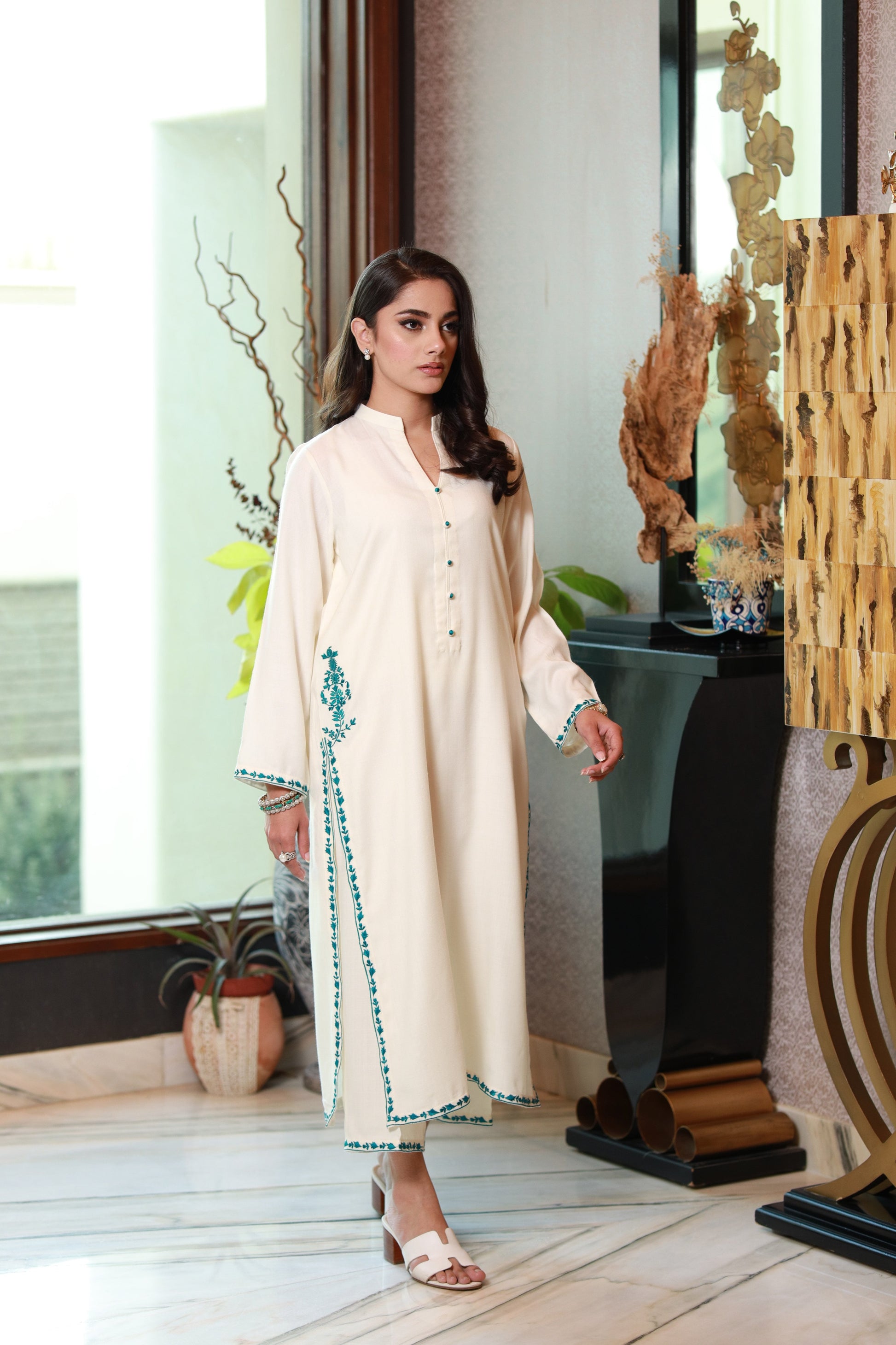 An exquisite piece that features a pristine off-white kameez paired elegantly with matching culottes. The ensemble is adorned with intricate teal embroidery, adding a touch of sophistication and cultural charm to your style.