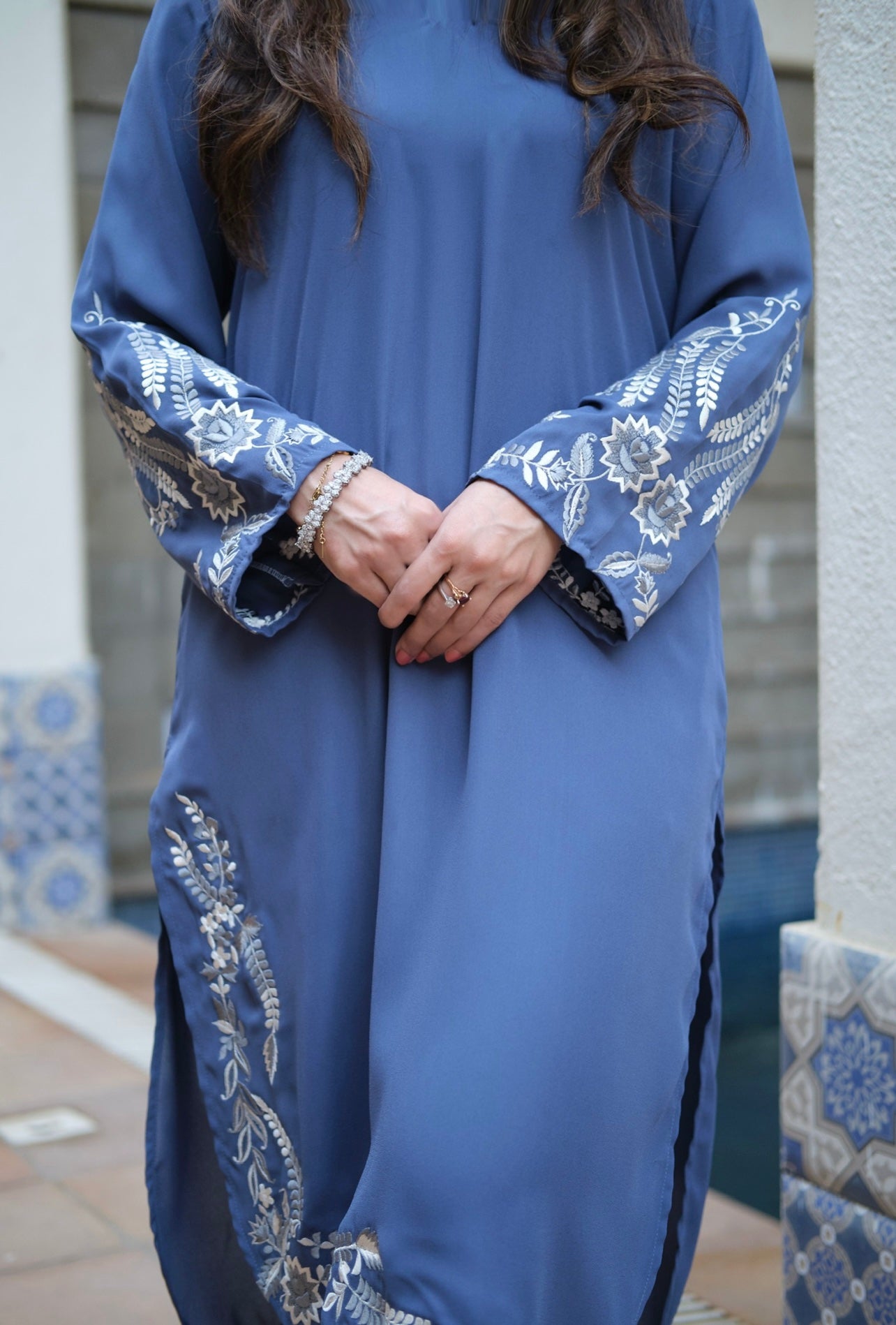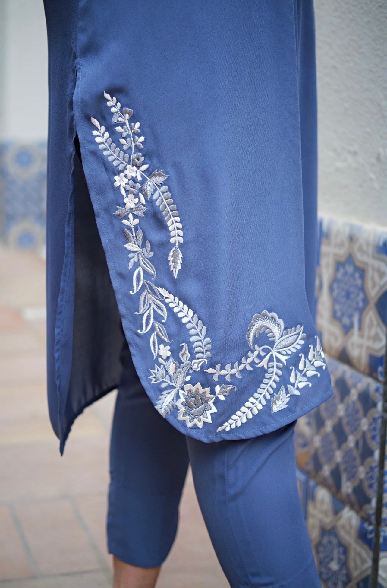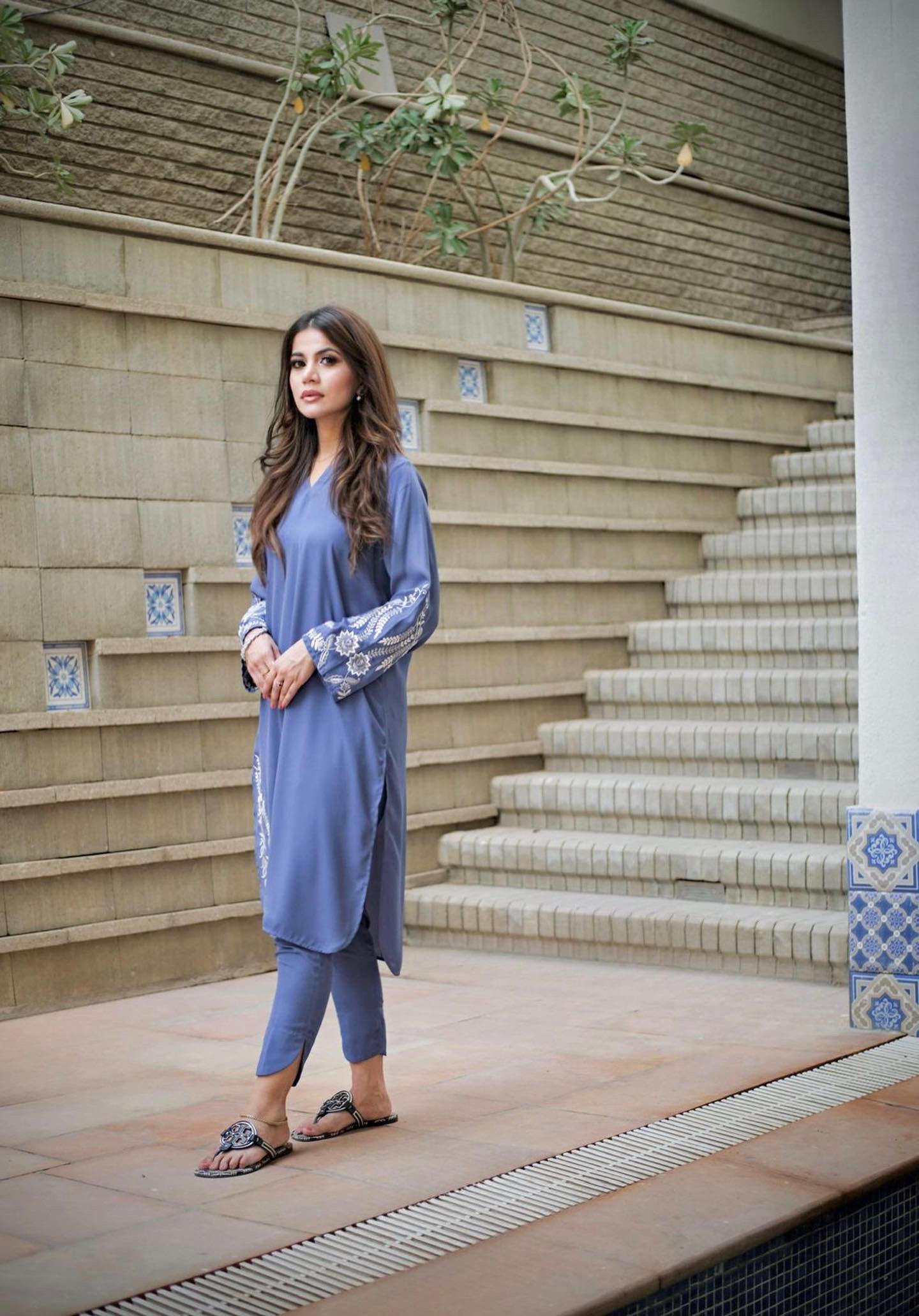 Step into the world of elegance with our mesmerising ink blue two-piece. Adorned with intricate embroidery on the sleeves and daman, this piece is a true work of art. Crafted in luxurious georgette fabric, it offers a lightweight and graceful drape. Elevate your style with this stunning piece that effortlessly combines classic beauty with contemporary charm.