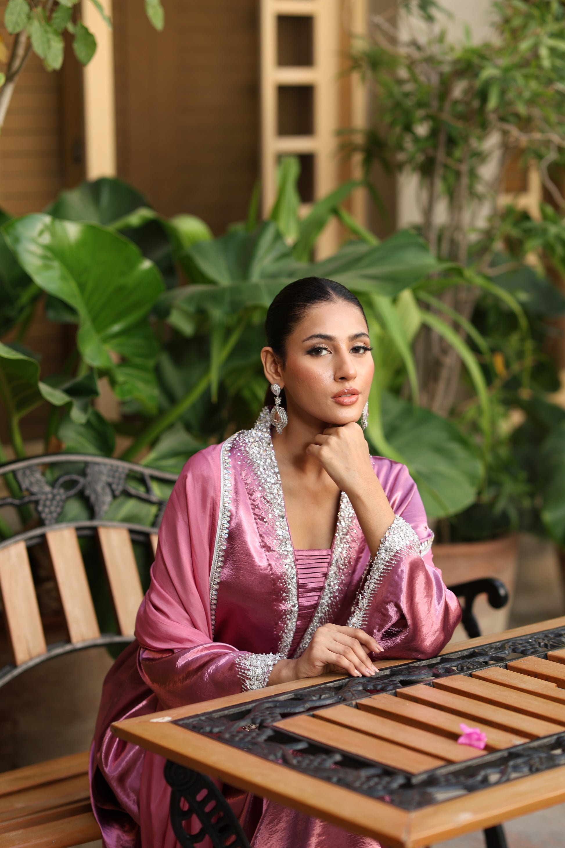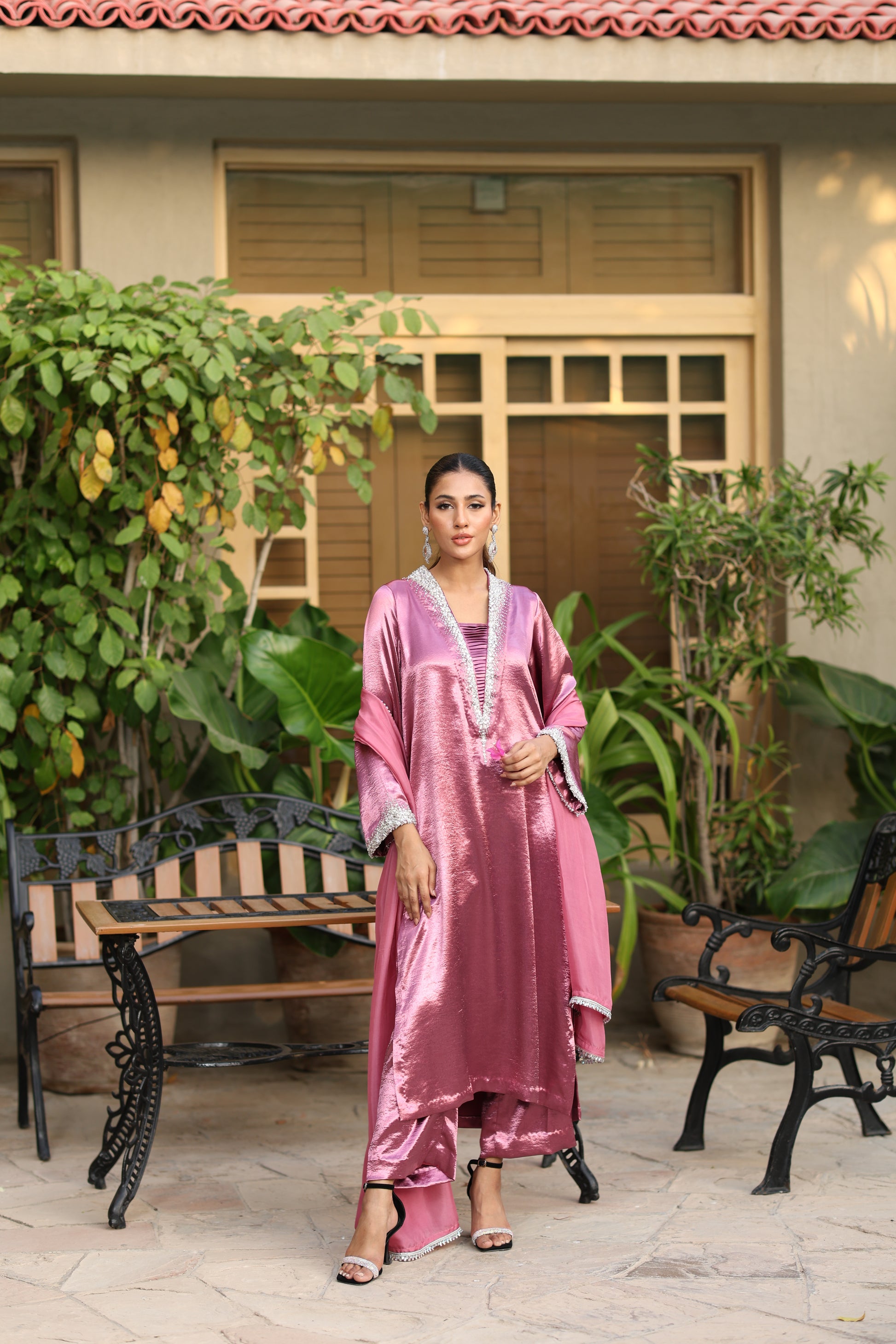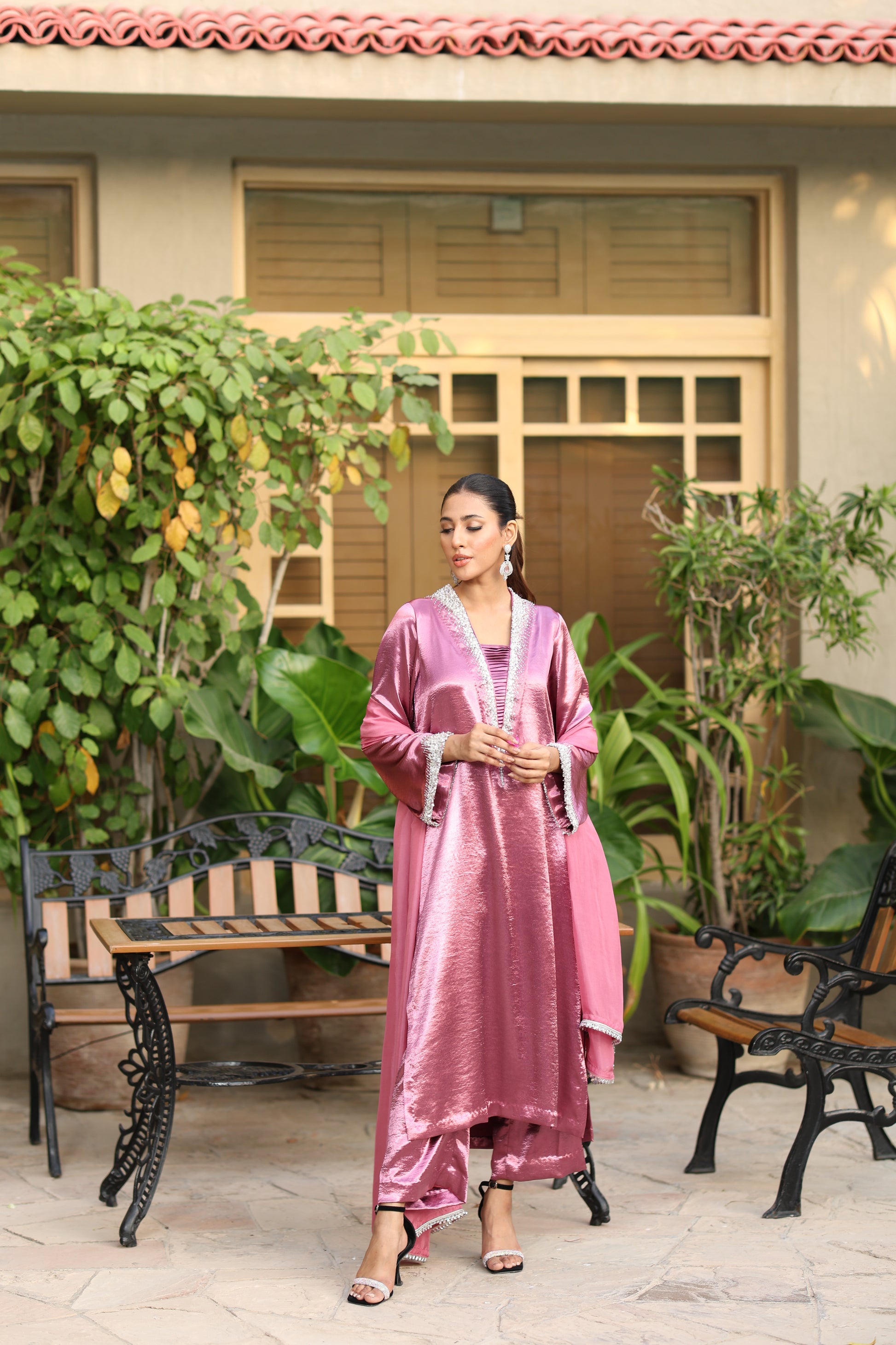 This set includes intricate handwork detailing on the neckline and sleeves, adding a touch of elegance. The V-neck design enhances its flattering silhouette, while the delicate work on the edges brings a refined, artisanal quality to the piece. Perfect for any occasion where you want to stand out with subtle sophistication.
