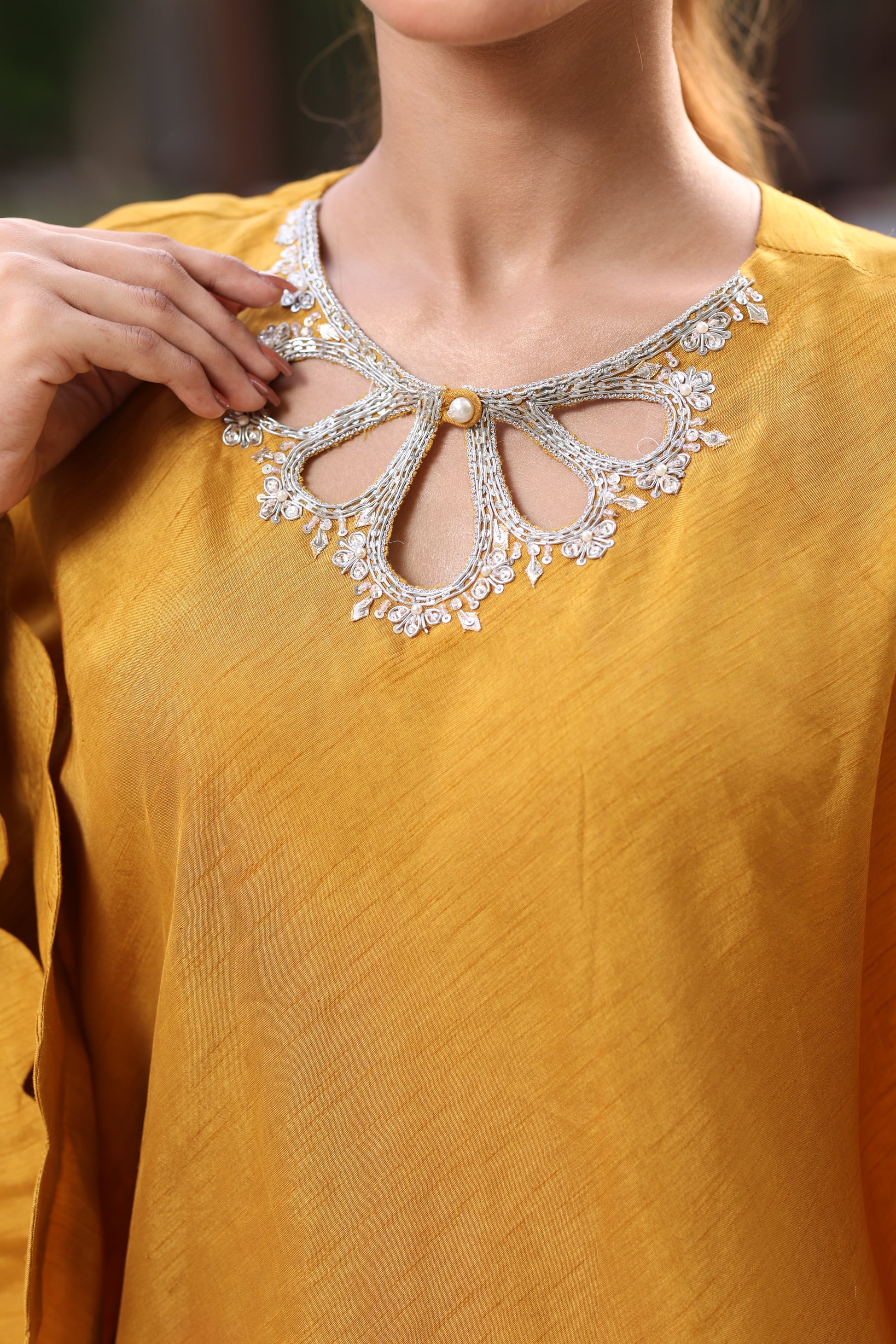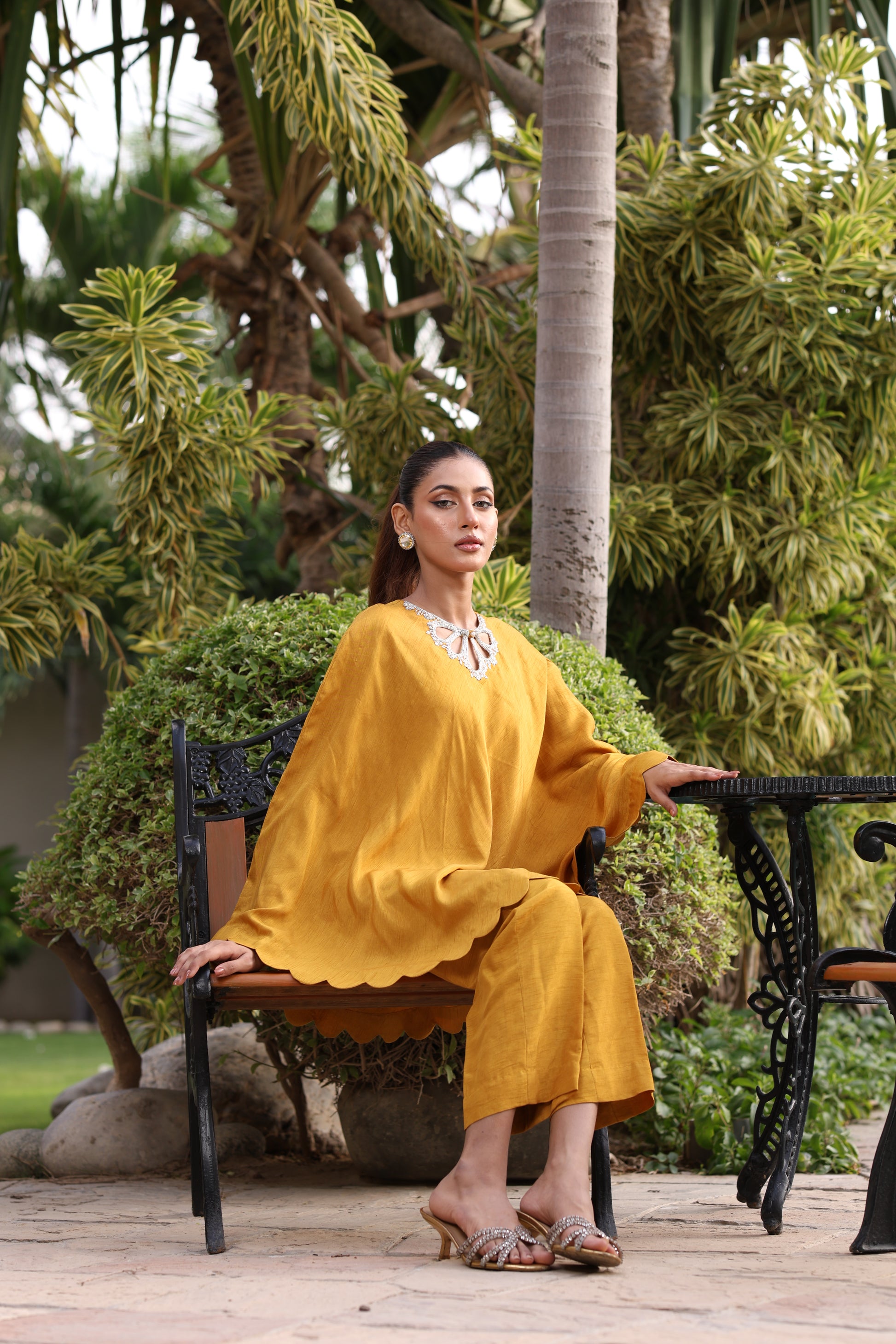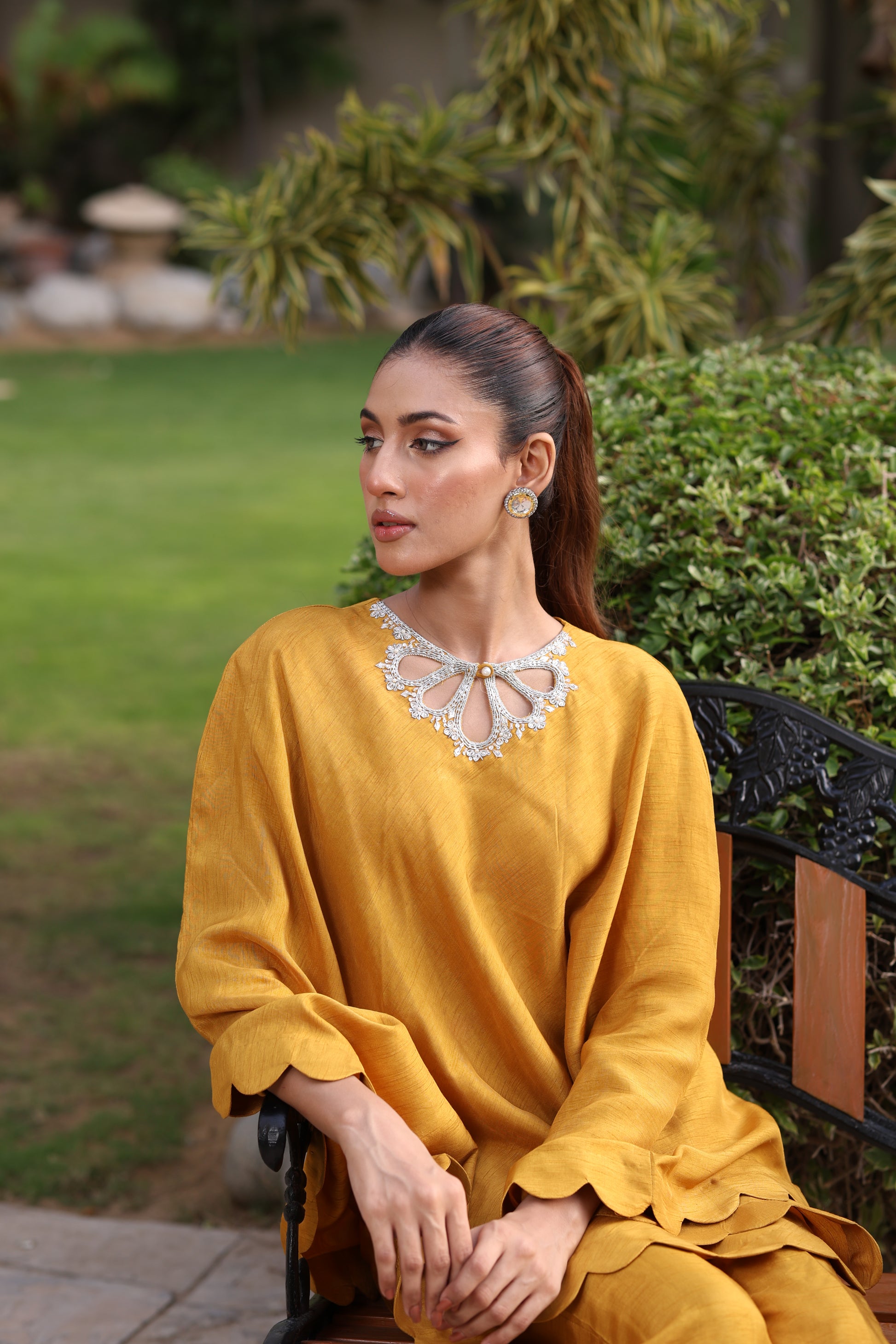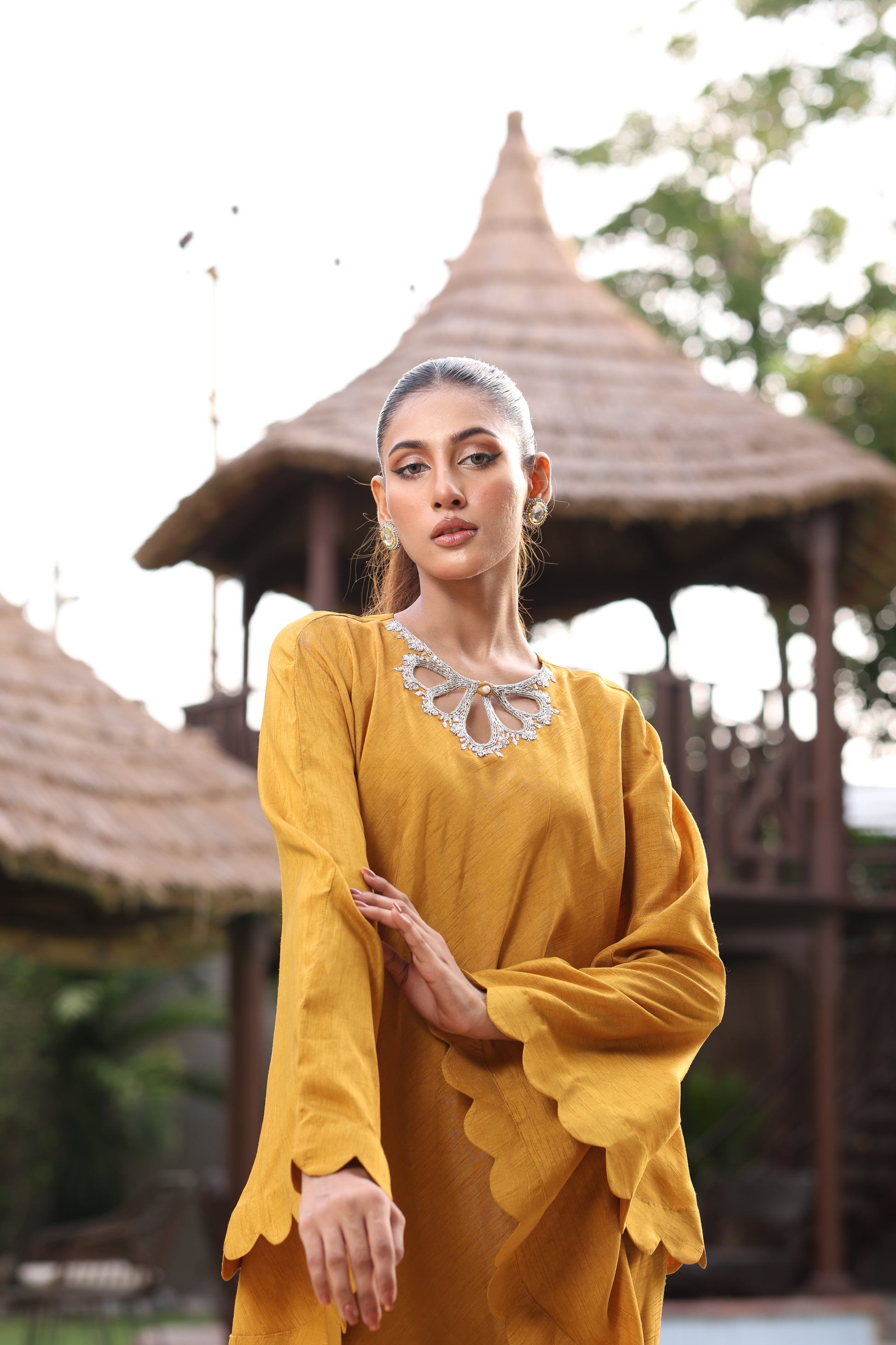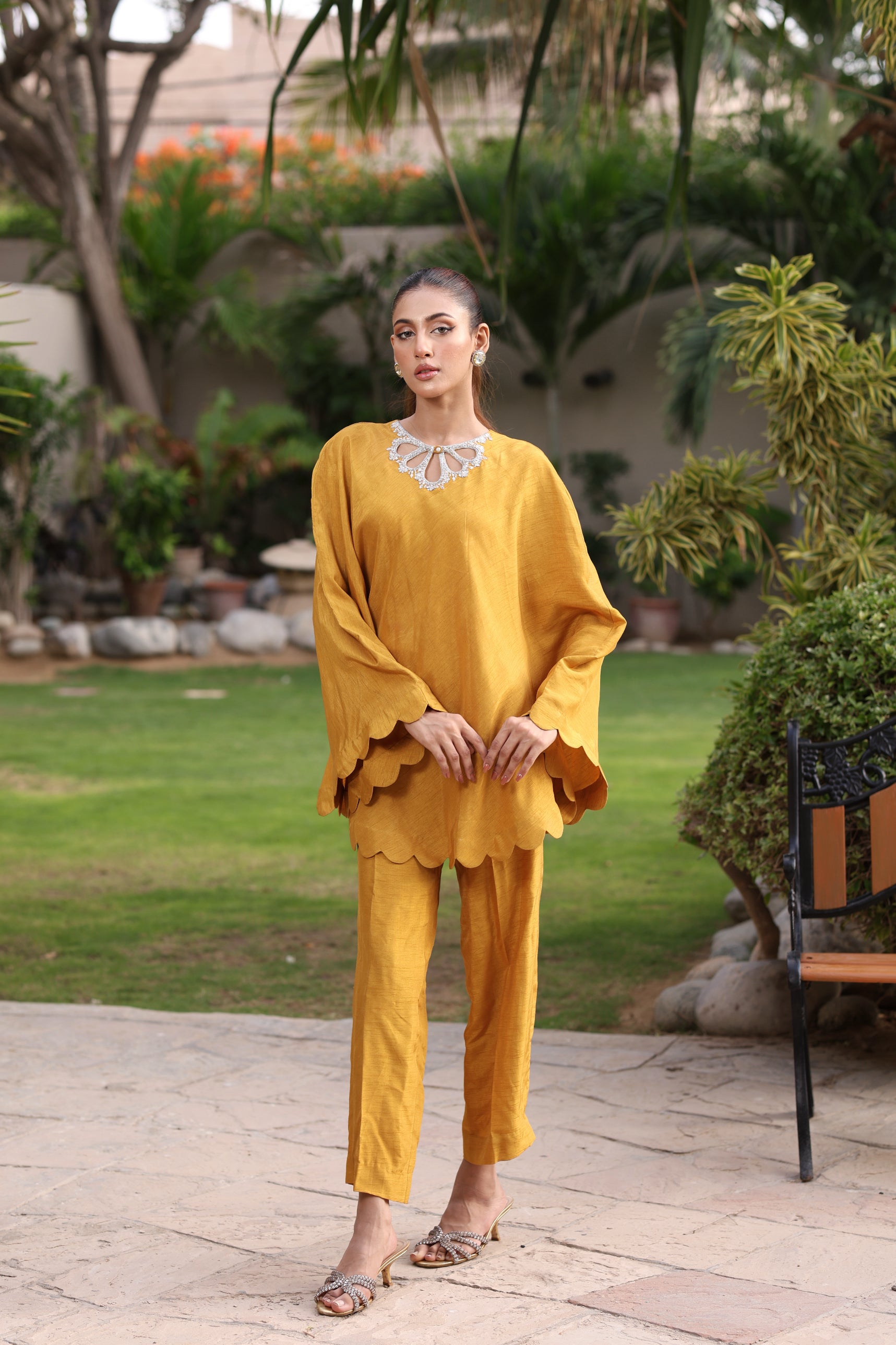 Dazzle in the warmth of mustard with this enchanting outfit. The butterfly-cut short kameez is a symphony of style, featuring intricate handwork that adorns the neckline, showcasing meticulous craftsmanship. Paired with matching pants, this outfit is a testament to modern elegance.
