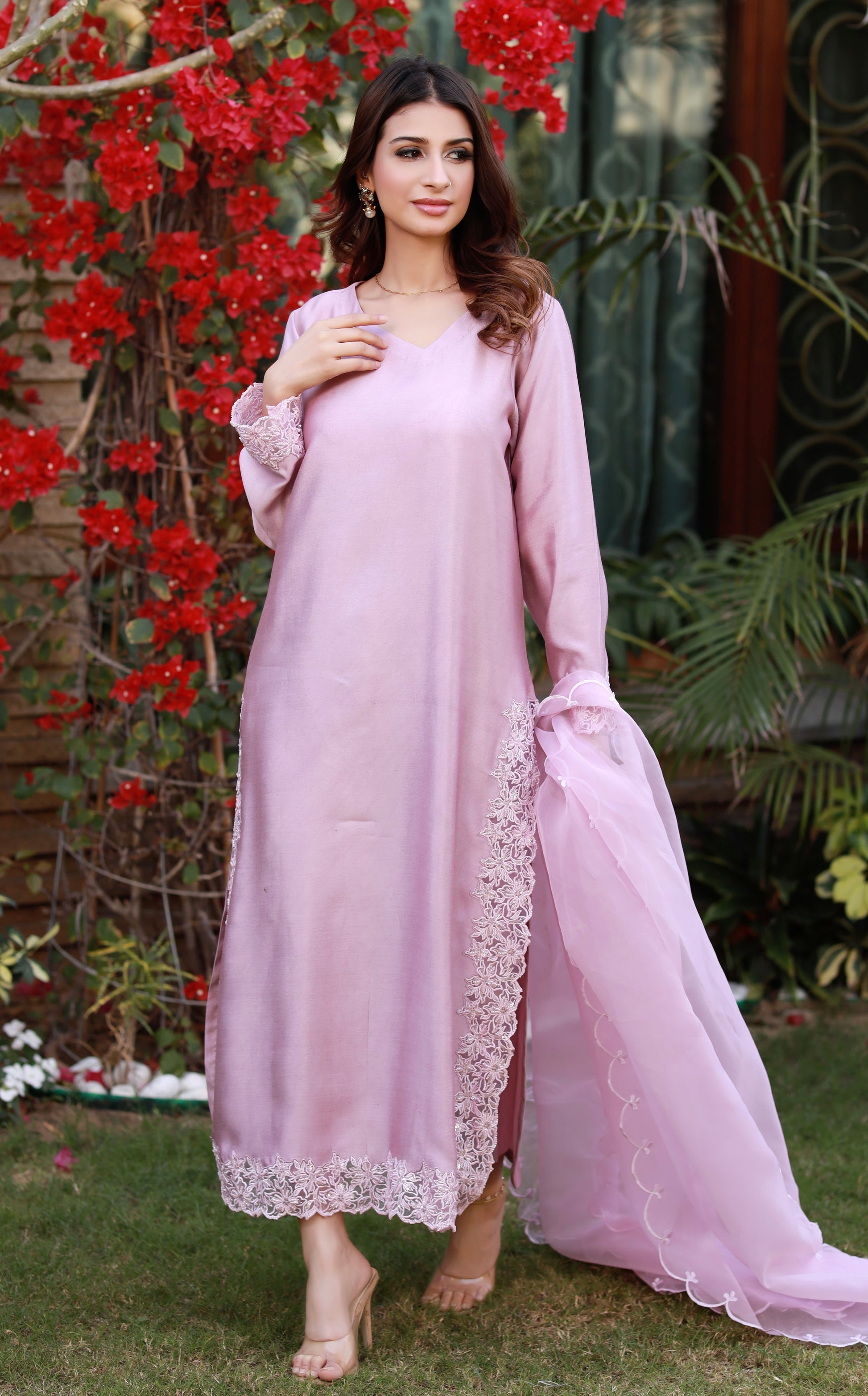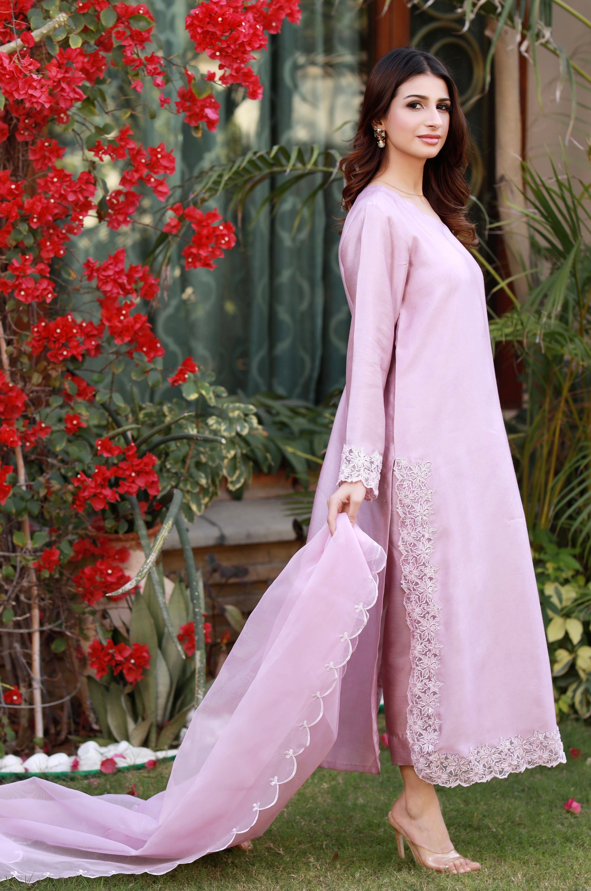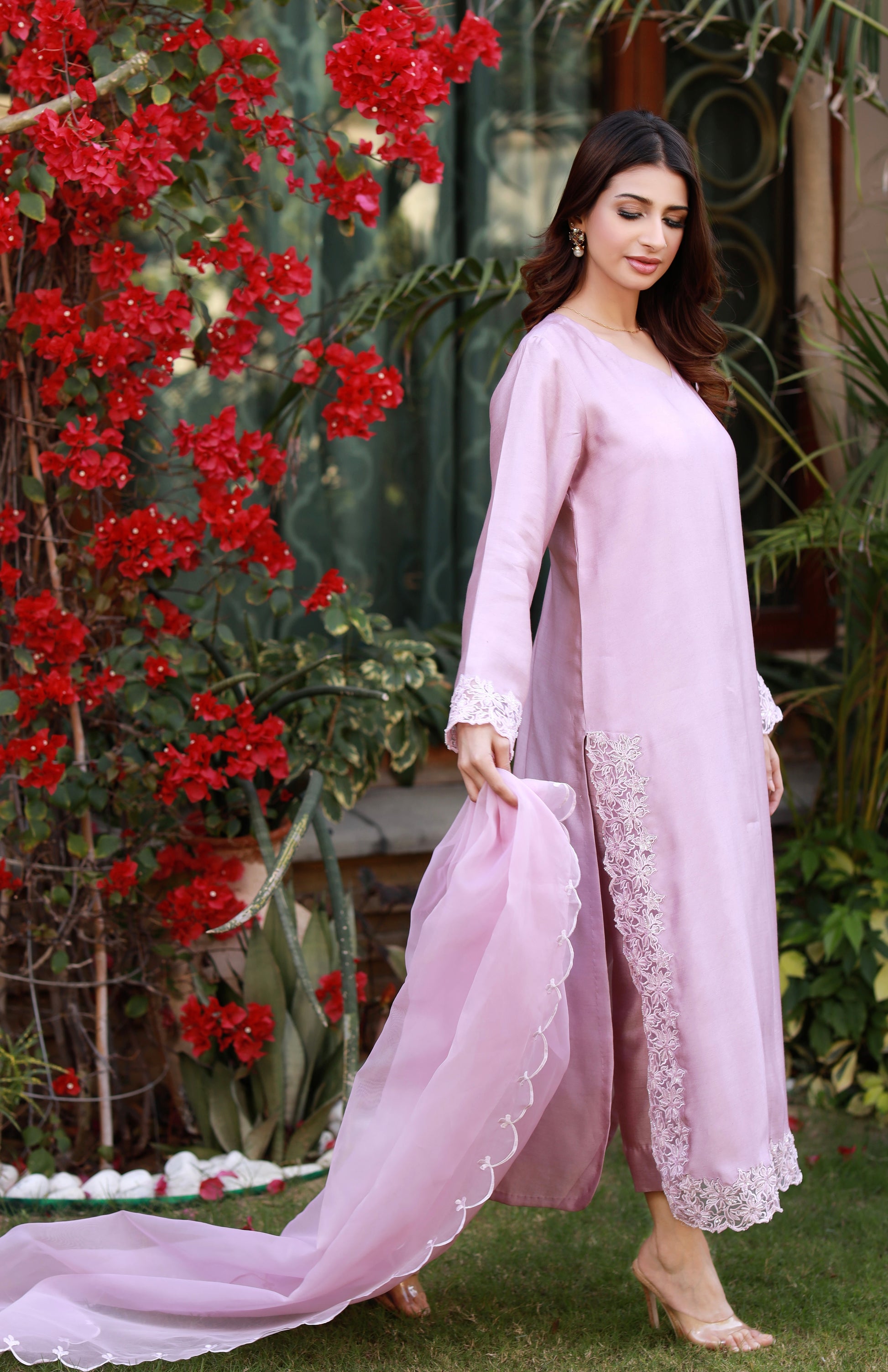 In a symphony of sophistication, this outfit features a lilac long kameez paired with matching pants crafted in the luxurious silk fabric. Impeccable detailing graces the chaak-daman and sleeves to add a touch of opulence to the outfit.
