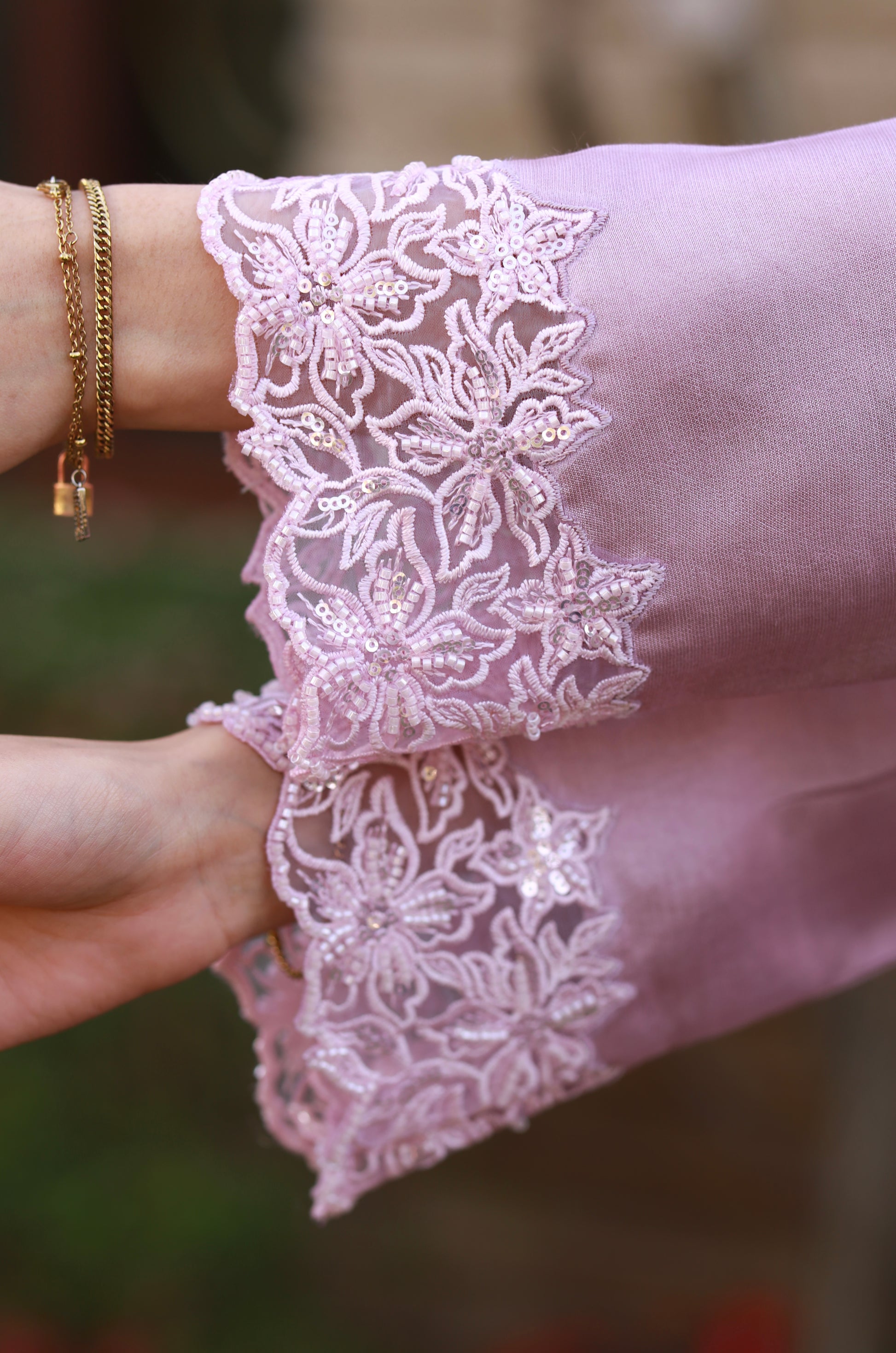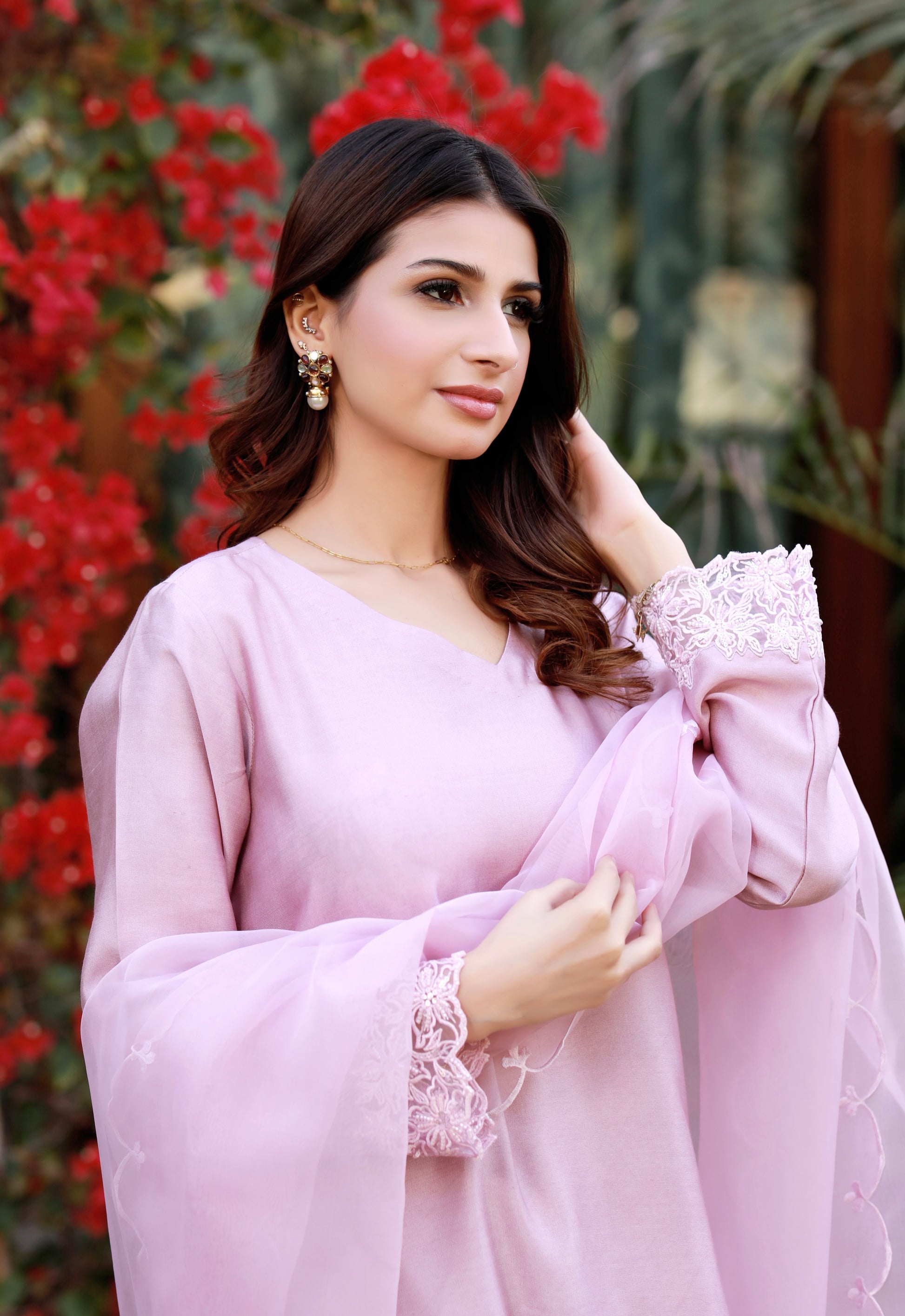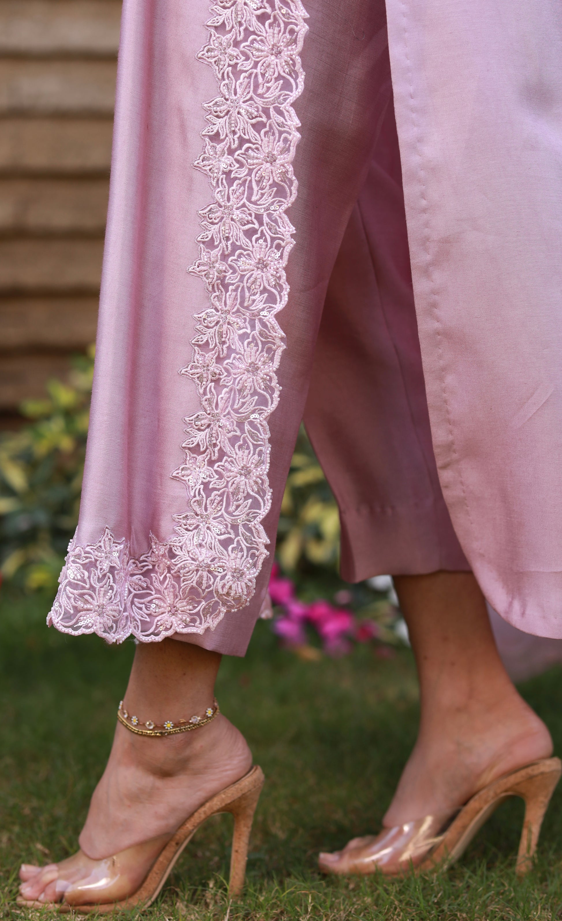 In a symphony of sophistication, this outfit features a lilac long kameez paired with matching pants crafted in the luxurious silk fabric. Impeccable detailing graces the chaak-daman and sleeves to add a touch of opulence to the outfit.