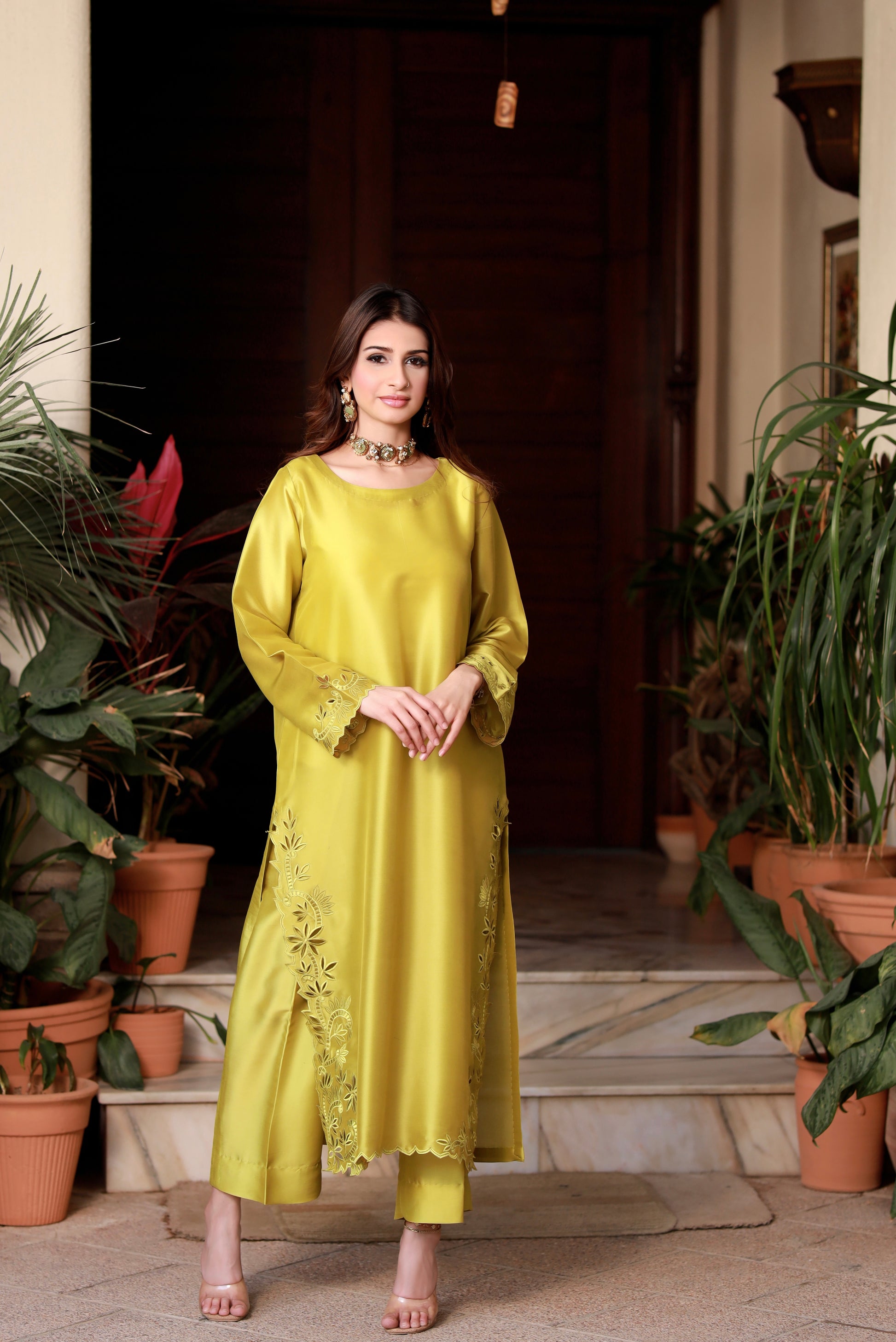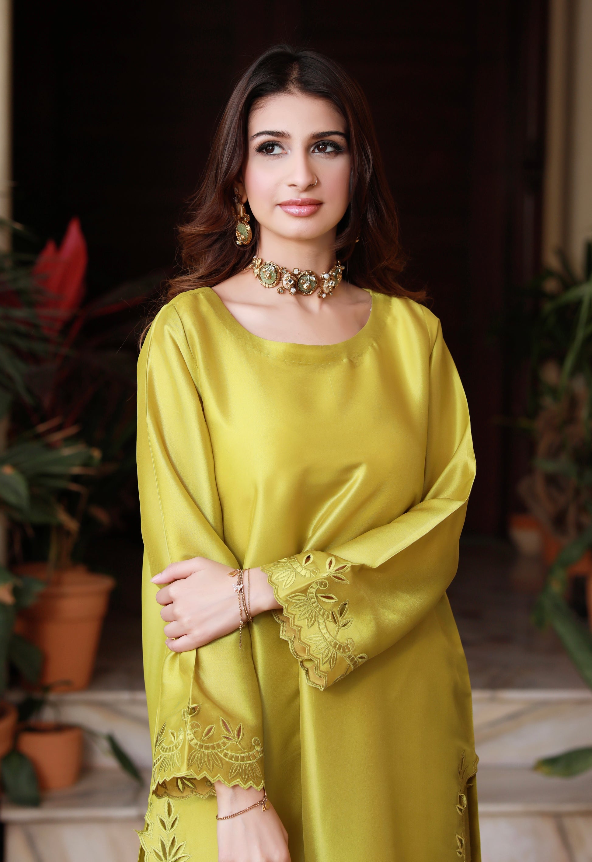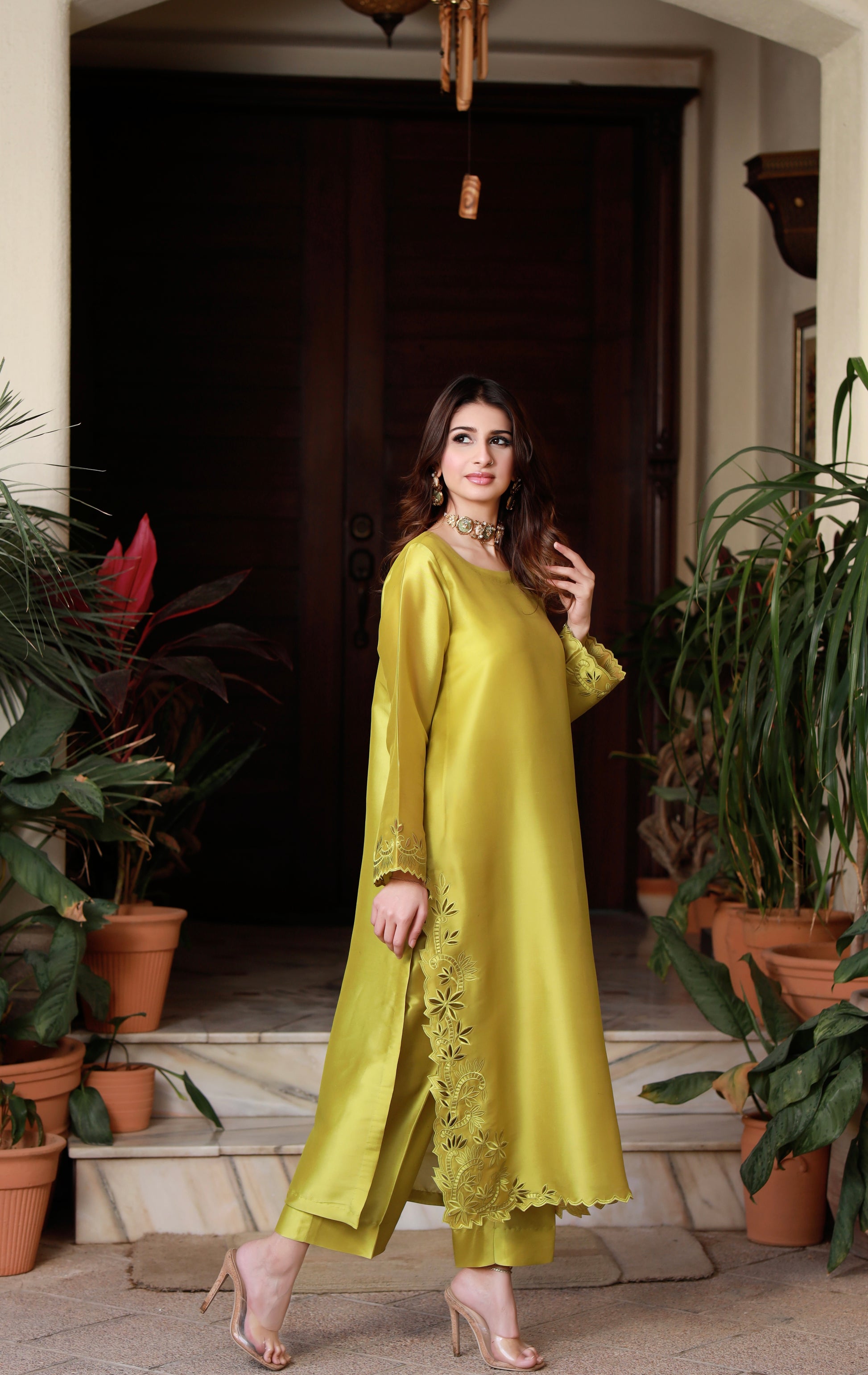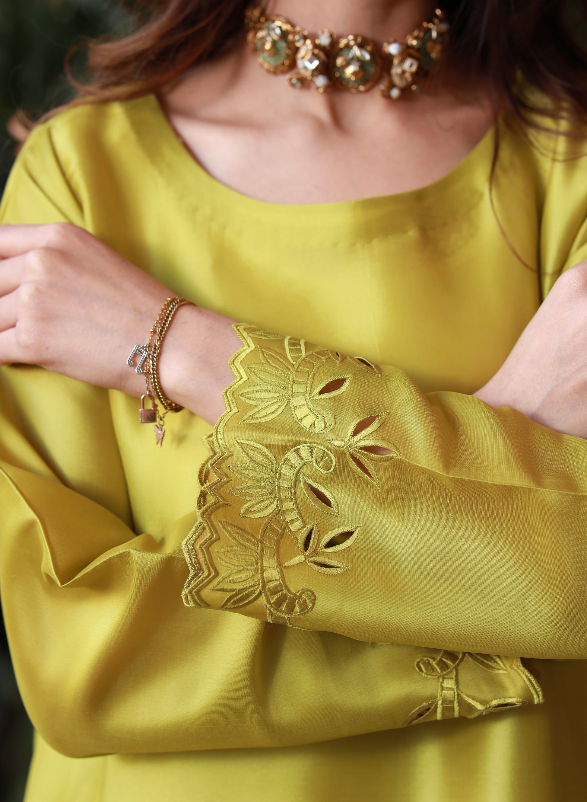 Dazzling in its vibrancy, this ensemble commands attention to the neon yellow colour making a statement on its own. This piece has been crafted from sumptuous silk and its allure deepens as cutwork embroidery delicately graces the chaak and sleeves - creating a mesmerising interplay of texture and colour. The long kameez has been paired with matching culottes to complete the look.