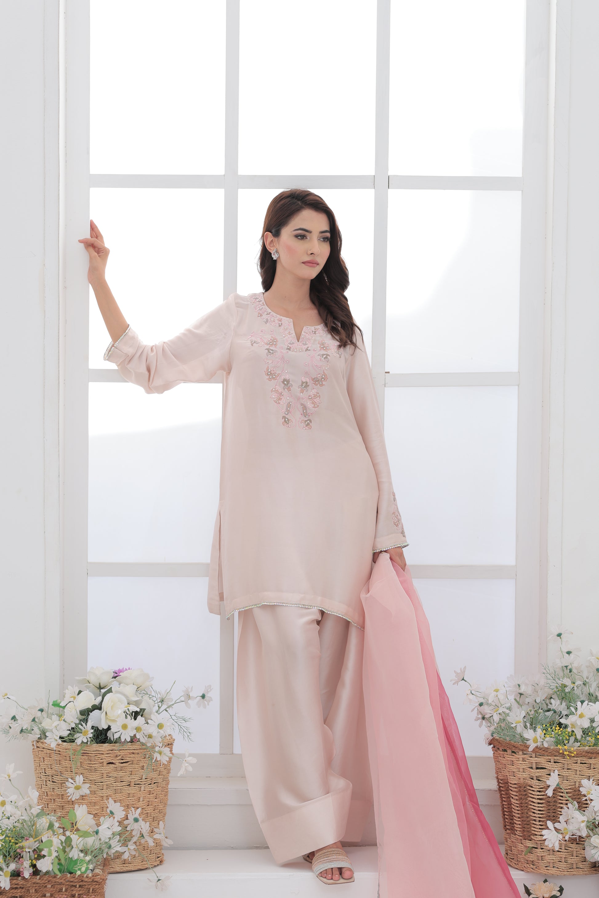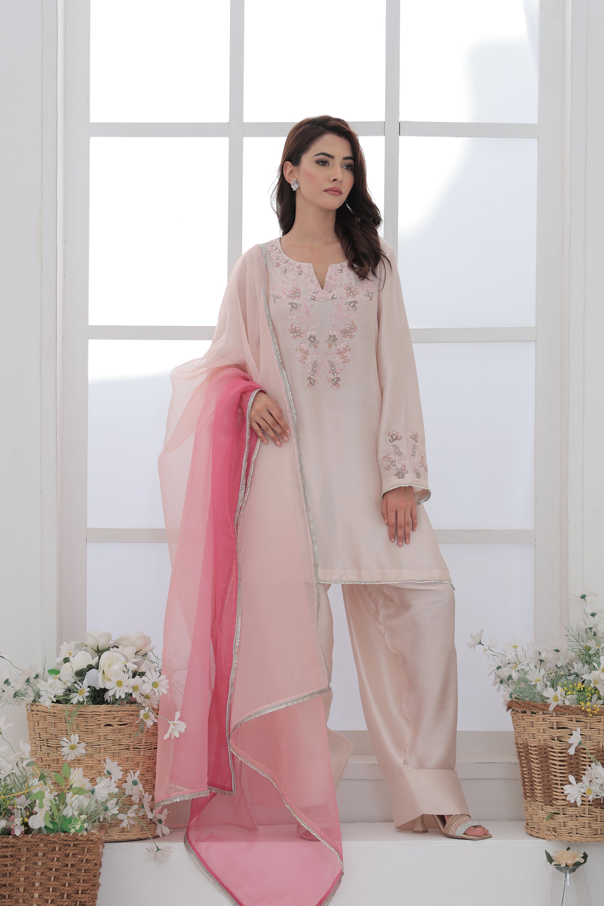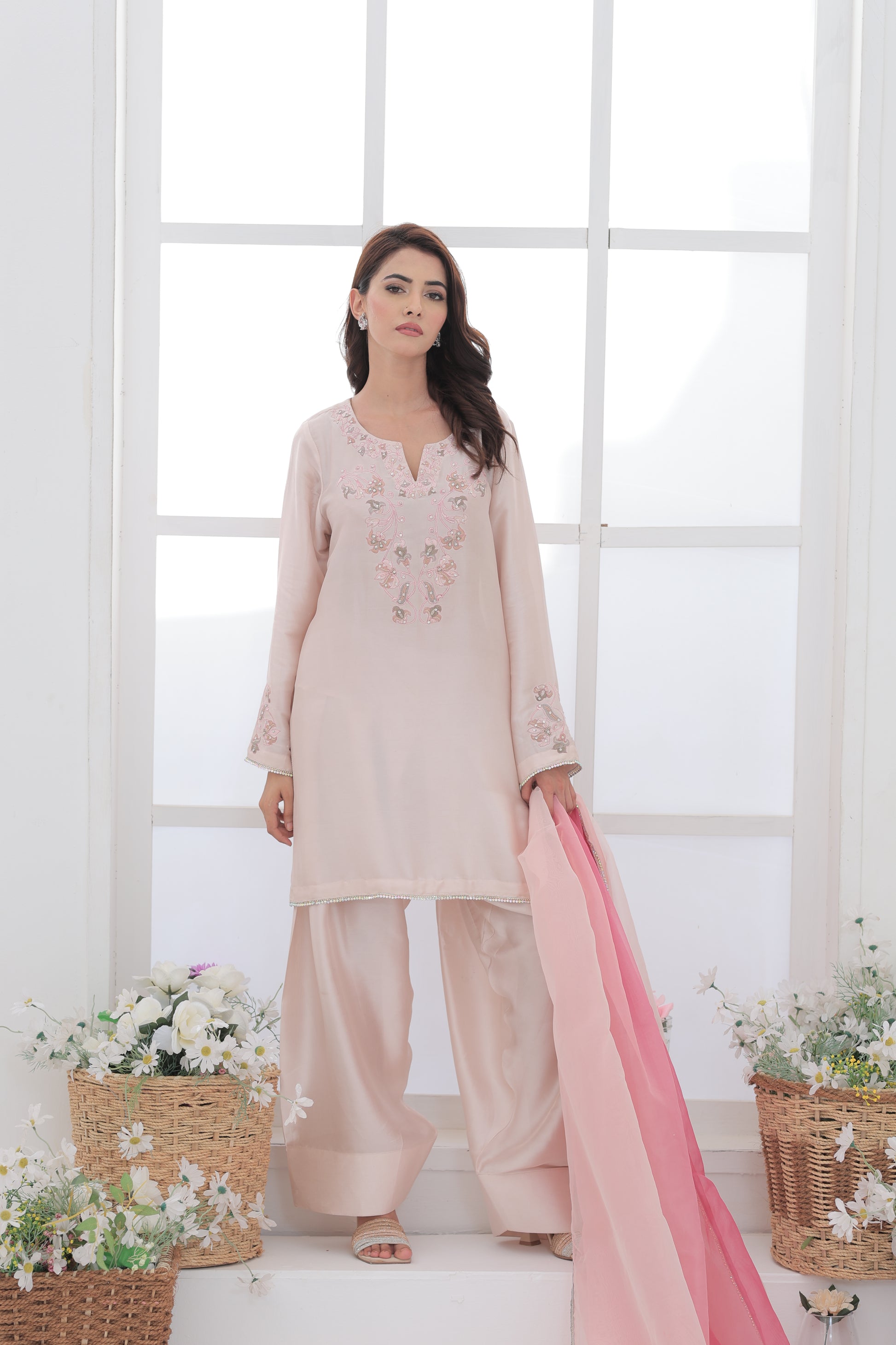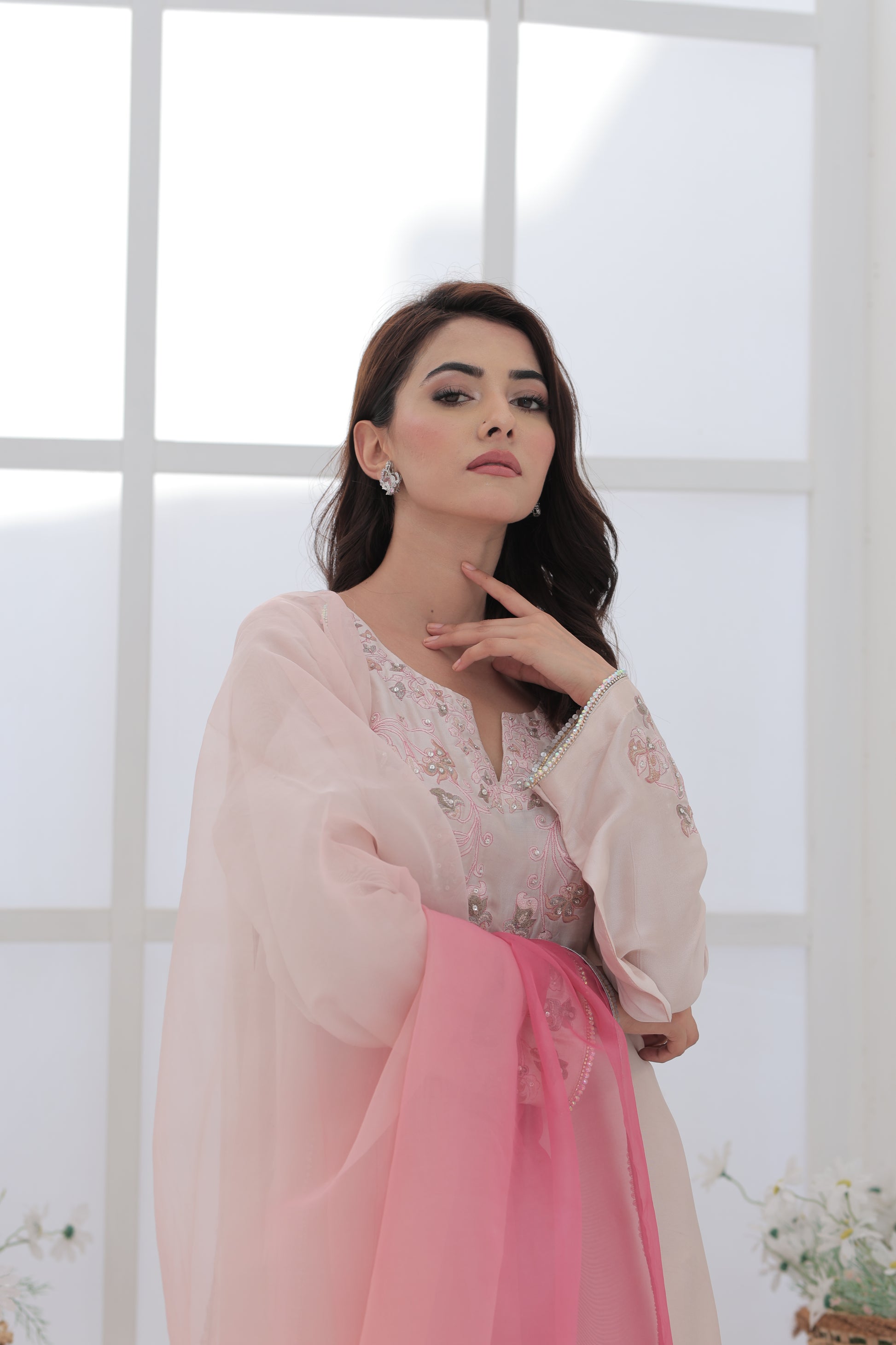 This pastel pink pure shisha butter silk shirt featuring delicate embroidery and intricate handwork on the neckline and sleeves, paired with a classic farshi shalwar for a touch of traditional flair and complemented by a pure organza dupatta in ethereal triple shades.