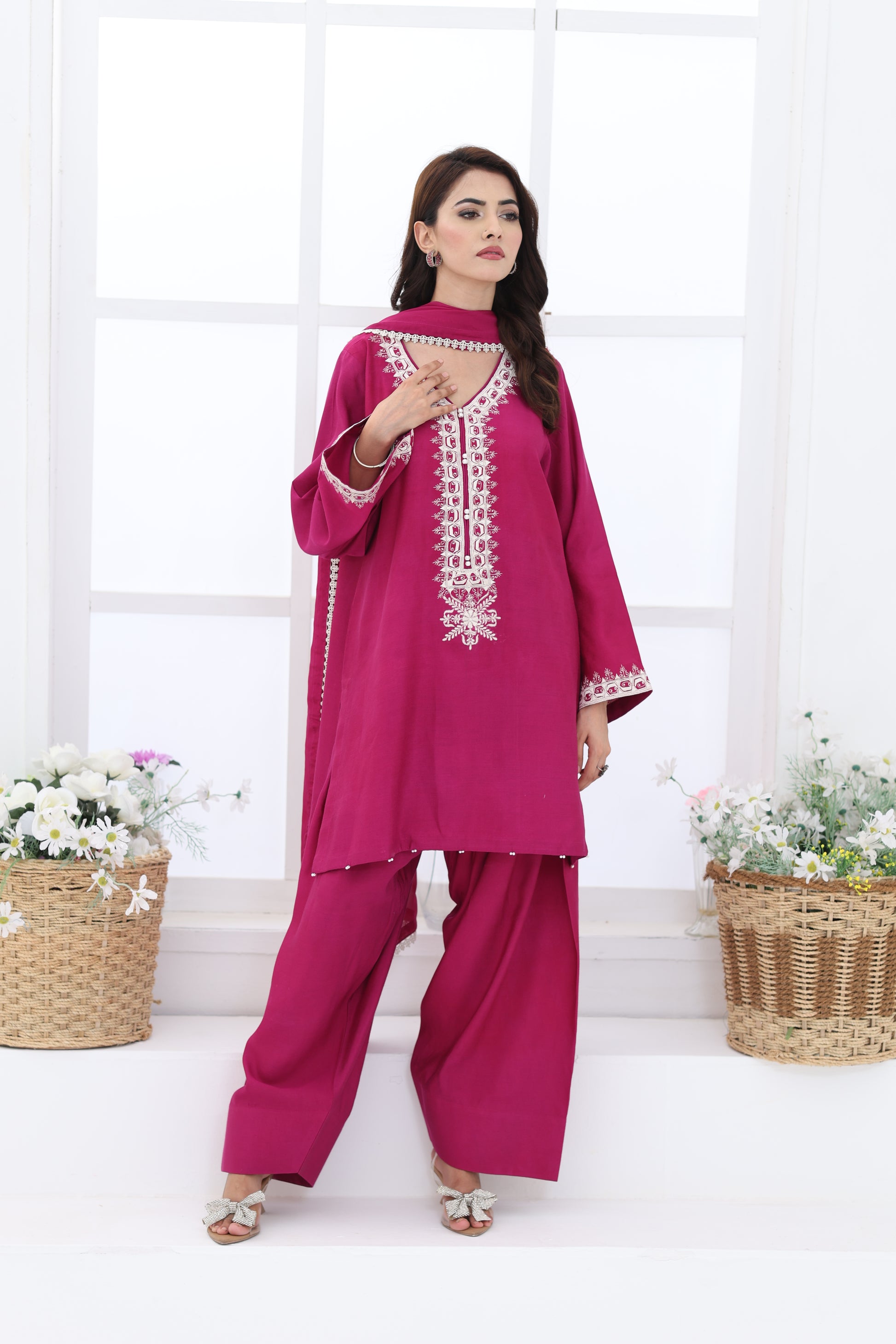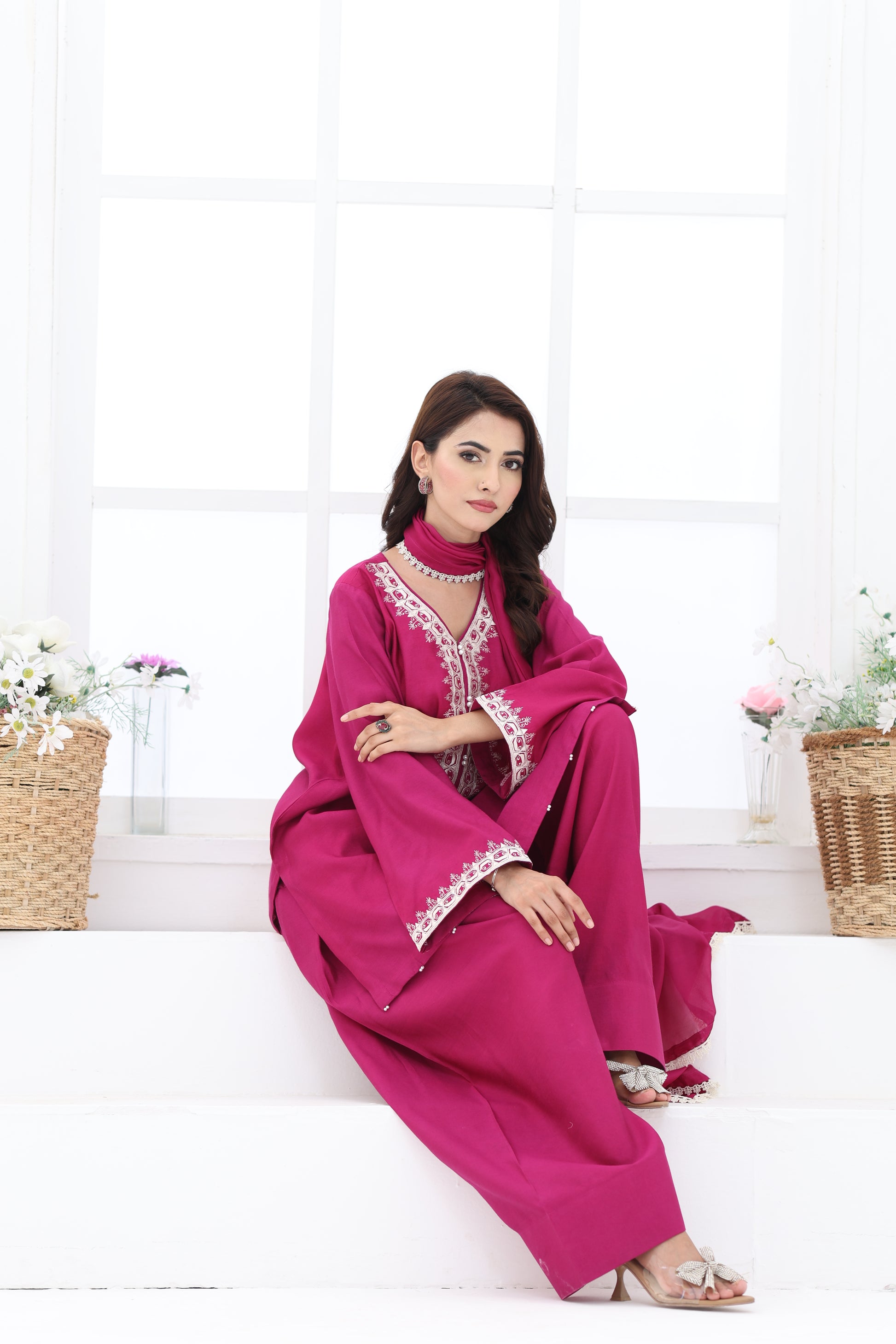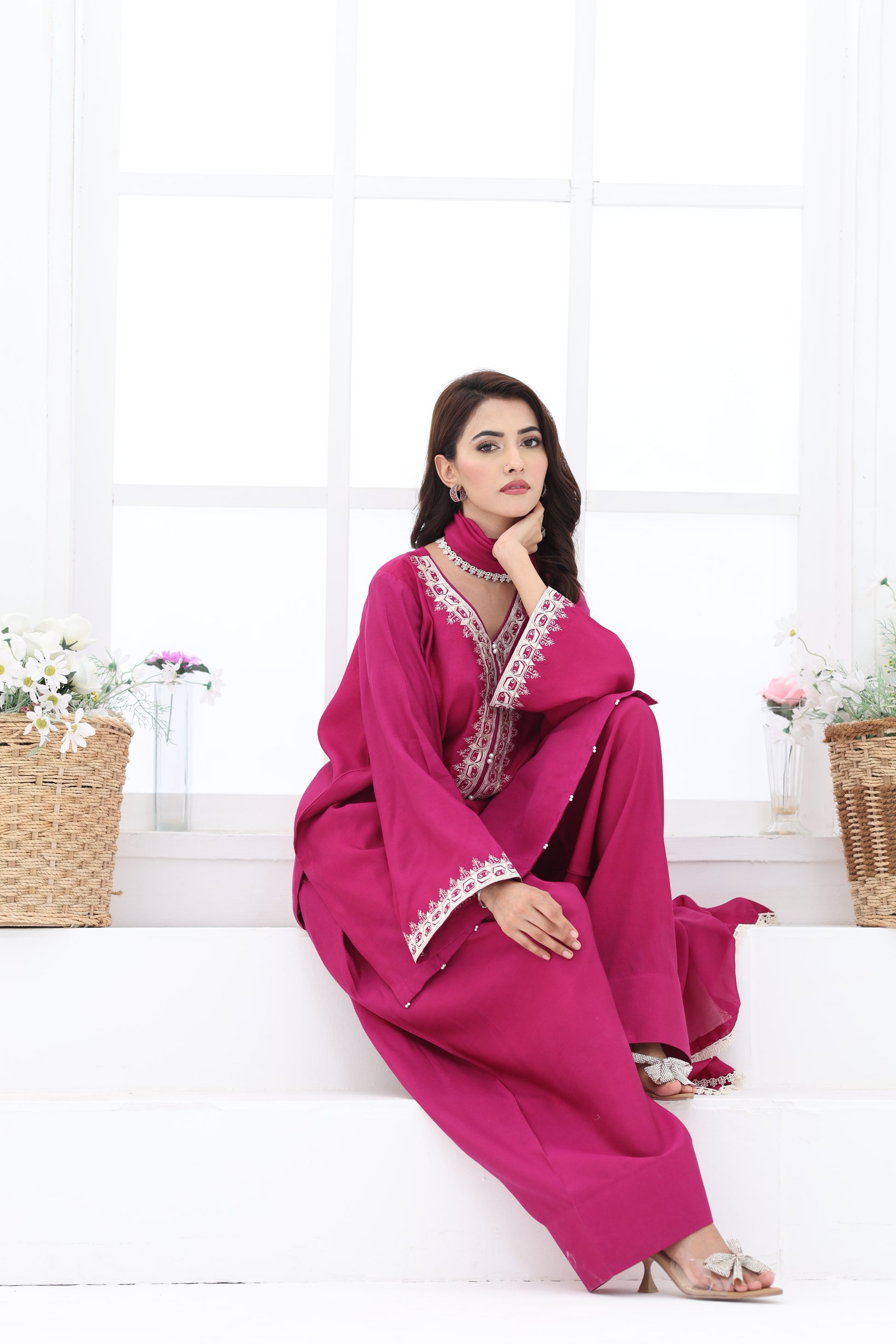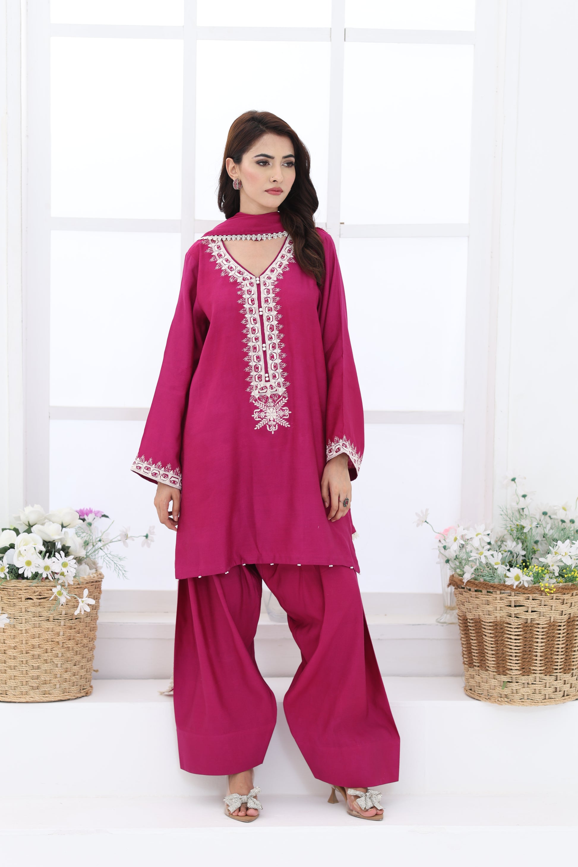 Make a bold yet elegant statement in this magenta pure khaddi silk outfit. The shirt features intricate embroidery along the neckline and sleeves, paired with a gracefully flared farshi shalwar and a matching silk dupatta adorned with delicate pearl and lace detailings.